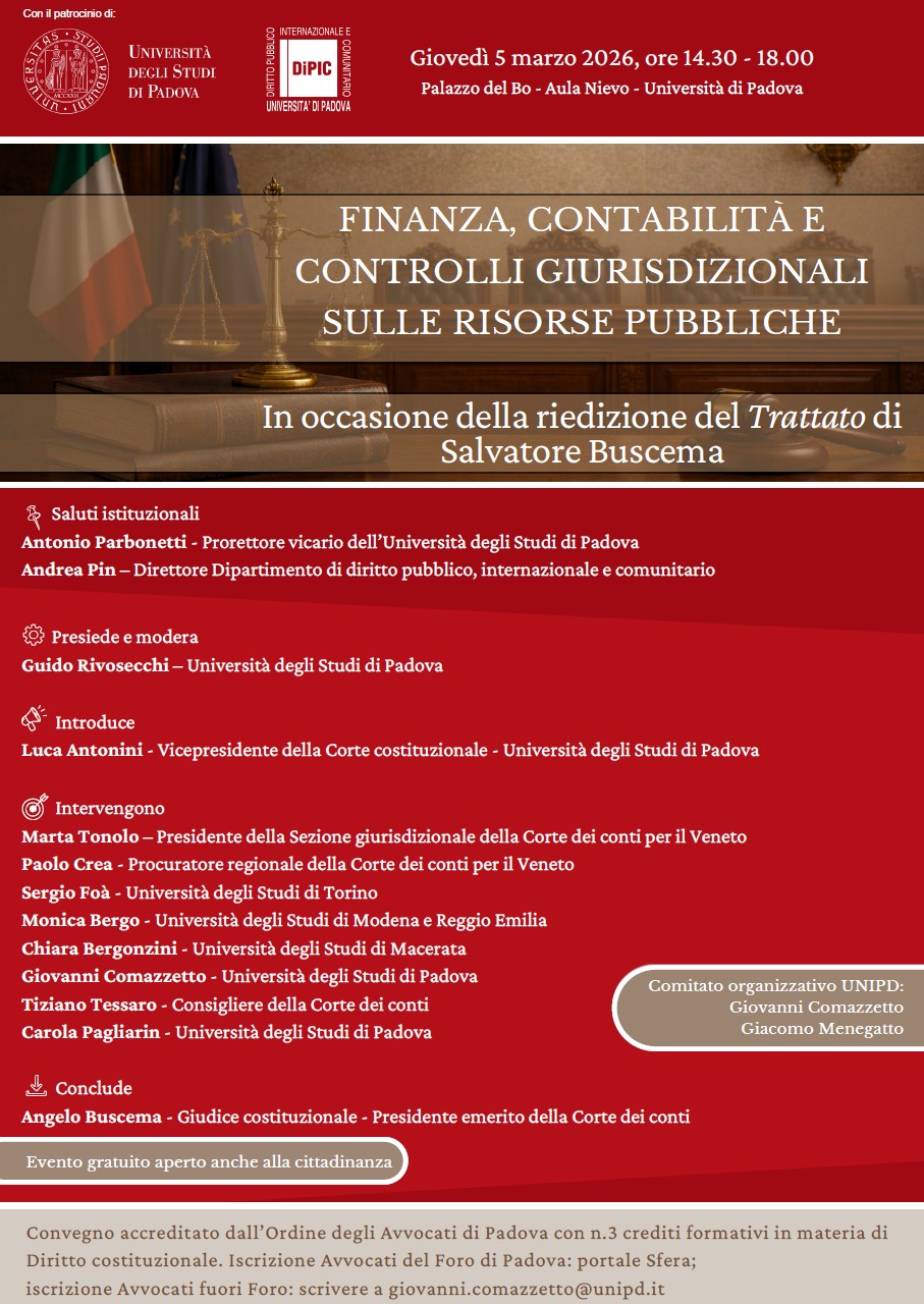 Giovedì 5 marzo 2026, dalle ore 14.30 alle 18.00, presso il Palazzo del Bo – Aula Nievo dell’Università di Padova, avrà luogo il convegno dedicato ai temi della finanza pubblica e dei controlli giurisdizionali, organizzato in occasione della riedizione del Trattato di Salvatore Buscema.